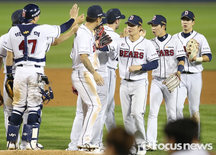 (서울=포커스뉴스) 6일 서울 잠실구장에서 열린 2016 프로야구 넥센-두산 경기에서 넥센에 4-1로 승리한 두산 선수들이 마운드에 모여 하이파이브하고 있다.