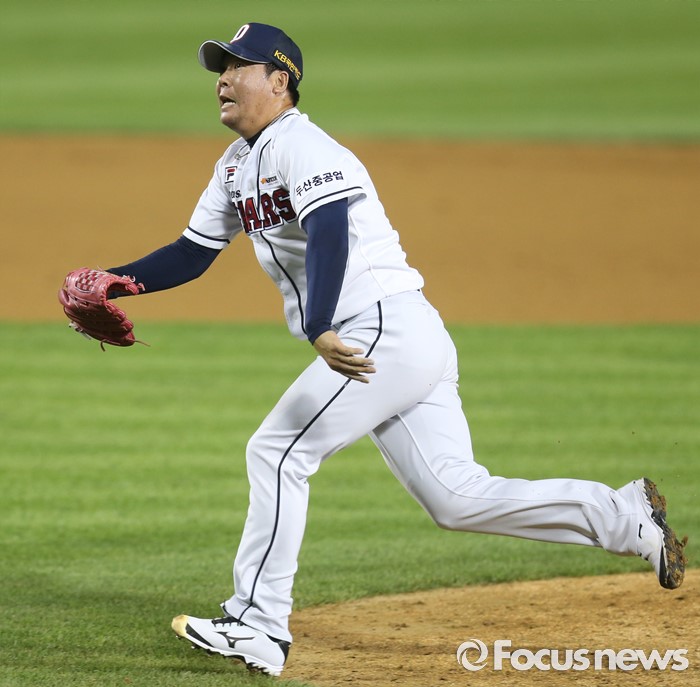 (서울=포커스뉴스) 6일 서울 잠실구장에서 열린 2016 프로야구 넥센-두산 경기 9회초 무사 1루에서 두산 마무리 투수 이현승이 넥센 김민성의 투수앞 땅볼 타구를 잡으려 달려가고 있다.