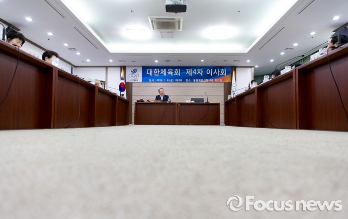 (서울=포커스뉴스) 8일 오전 서울 송파구 올림픽파크텔에서 열린 대한체육회 제4차 긴급 임시 이사회에서 강영중 대한체육회 회장이 인사말을 하고 있다. 이번 임시 이사회에서는 박태환의 리우 올림픽 출전 여부가 긴급 안건으로 상정됐다.