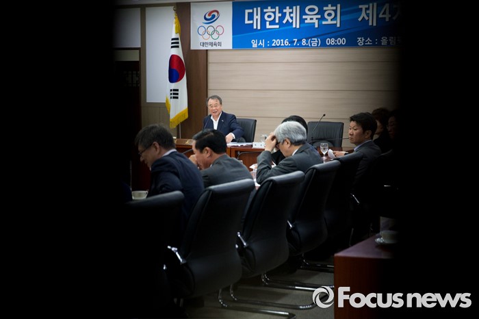 (서울=포커스뉴스) 8일 오전 서울 송파구 올림픽파크텔에서 열린 대한체육회 제4차 긴급 임시 이사회에서 강영중 대한체육회 회장이 인사말을 하고 있다. 이번 임시 이사회에서는 박태환의 리우 올림픽 출전 여부가 긴급 안건으로 상정됐다.