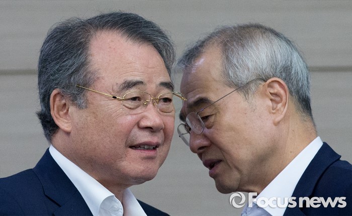 (서울=포커스뉴스) 8일 오전 서울 송파구 올림픽파크텔에서 열린 대한체육회 제4차 긴급 임시 이사회에서 강영중(왼쪽) 대한체육회 회장과 조영호 사무총장이 이야기를 나누고 있다. 이번 임시 이사회에서는 박태환의 리우 올림픽 출전 여부가 긴급 안건으로 상정됐다.