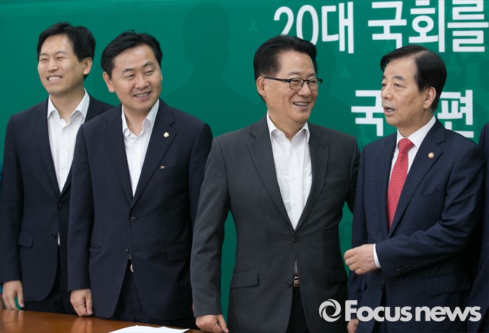 (서울=포커스뉴스) 한민구 국방부 장관이 8일 오전 서울 여의도 국회를 방문해 사드배치 등과 관련 국민의당 지도부와 면담에 앞서 취재진을 향해 포즈를 취하고 있다. 왼쪽부터 손금주 대변인, 김관영 원내수석부대표, 박지원 비대위원장, 한 장관.