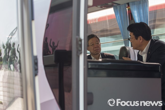 (서울=포커스뉴스) 박근혜 대통령과 새누리당 의원들의 오찬이 예정되있는 8일 오전 서울 여의도 국회에서 김희옥(오른쪽 두 번째) 새누리당 혁신비상대책위원장과 정진석 새누리당 원내대표가 청와대로 이동하는 버스에 탑승해 대화 하고 있다.