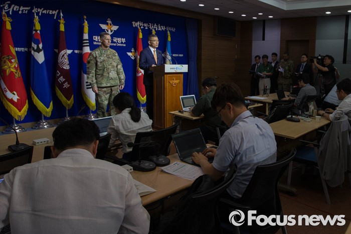(서울=포커스뉴스) 8일 오전 서울 용산구 국방부 브리핑실에서 류제승 국방부 국방정책실장(오른쪽)과 토머스 벤달 주한미군 8군 사령관(왼쪽)이 주한미군 사드(THAAD) 배치 결정 발표와 주한민국의 사드 배치 가능성에 대한 공식협의 개시를 발표하고 있다.