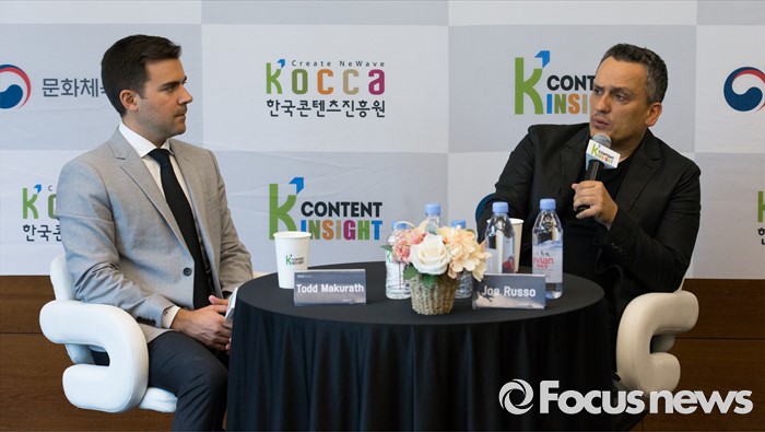 (서울=포커스뉴스) '캡틴 아메리카:시빌워' 조 루소(Joe Russo)(오른쪽) 감독과 영화사 불릿의 토드 마커리스(Todd Makurath) 대표가 8일 오전 서울 마포구 누리꿈스퀘어에서 열린 제2차 콘텐츠 인사이트 기자간담회에 참석해 취재진 질문에 답변하고 있다.