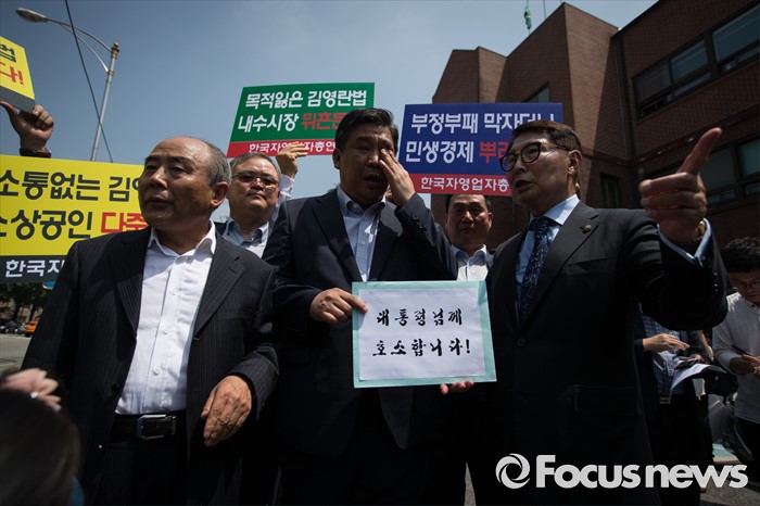 (서울=포커스뉴스) 한국자영업자총연대 등 소상공인 단체가 8일 오전 서울 종로구 청운효자동주민센터 앞에서 '부정청탁 및 금품 등 수수의 금지에 관한 법률(김영란법)' 시행저지 기자회견을 열고 최승재 소상공인연합회장(가운데)이 대통령에게 전하는 호소문을 들고 청와대를 향하고 있다.