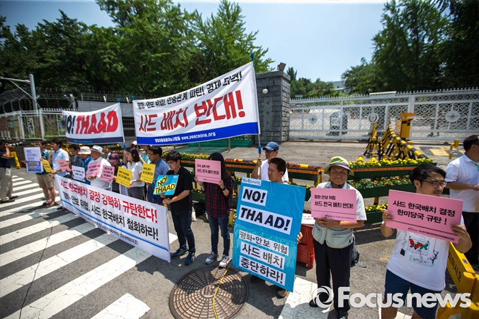 (서울=포커스뉴스) 국방부가 사드의 한국 배치를 결정한 8일 오후 서울 용산구 국방부 앞에서 사드 한국 배치를 규탄하는 평화와 통일을 여는 사람들 관계자들의 시위가 열리고 있다.