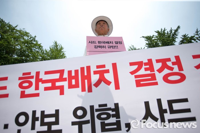 (서울=포커스뉴스) 국방부가 사드의 한국 배치를 결정한 8일 오후 서울 용산구 국방부 앞에서 사드 한국 배치를 규탄하는 평화와 통일을 여는 사람들 관계자들의 시위가 열리고 있다.