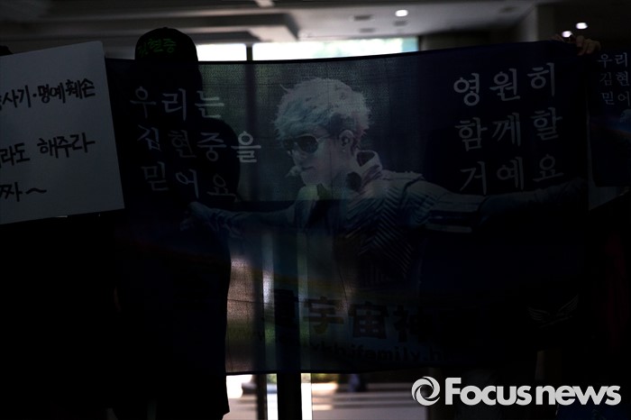 (서울=포커스뉴스) 8일 오후 서울중앙지방법원에서 전 여자친구와 민사소송 중인 가수 김현중의 홍콩, 일본, 중국 팬들이 김현중을 응원하는 손피켓을 들고 있다.