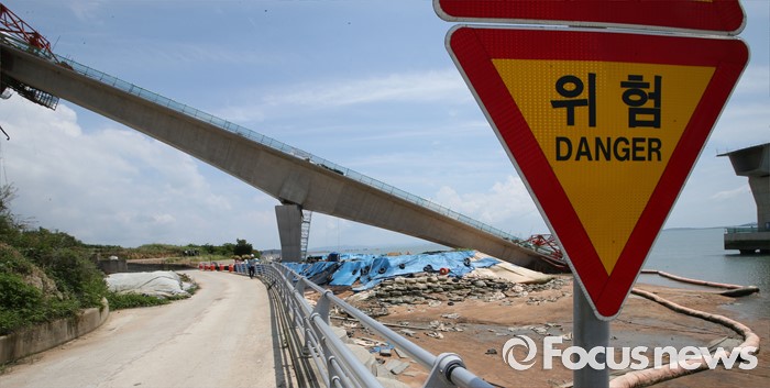 (영광=포커스뉴스) 8일 오전 전남 영광군 염산면과 무안군 해제면을 잇는 칠산대교 건설현장에서 상판 구조물이 무너져 노동자 6명이 부상을 입는 사고가 발생, 칠산대교는 가운데 교각을 중심으로 상판이 한쪽으로 기울듯 무너져 내려 있다.