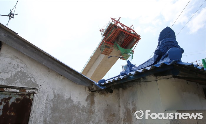 (영광=포커스뉴스) 8일 오전 전남 영광군 염산면과 무안군 해제면을 잇는 칠산대교 건설현장에서 상판 구조물이 무너져 노동자 6명이 부상을 입는 사고가 발생, 칠산대교는 가운데 교각을 중심으로 상판이 한쪽으로 기울듯 무너져 내려 있다.