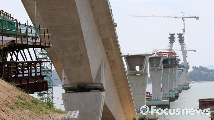 (영광=포커스뉴스) 8일 오전 전남 영광군 염산면과 무안군 해제면을 잇는 칠산대교 건설현장에서 상판 구조물이 무너져 노동자 6명이 부상을 입는 사고가 발생, 칠산대교는 가운데 교각을 중심으로 상판이 한쪽으로 기울듯 무너져 내려 있다.