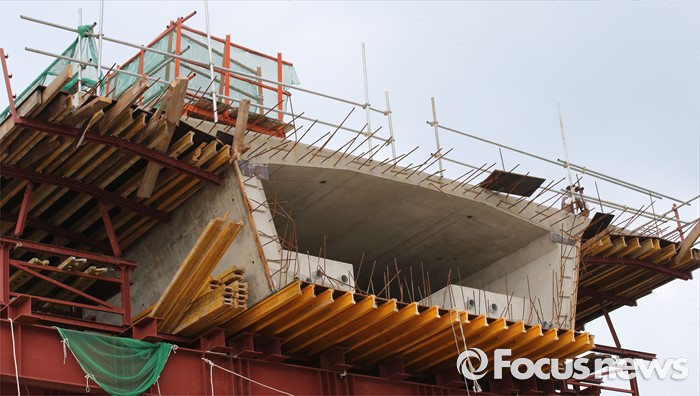 (영광=포커스뉴스) 8일 오전 전남 영광군 염산면과 무안군 해제면을 잇는 칠산대교 건설현장에서 상판 구조물이 무너져 노동자 6명이 부상을 입는 사고가 발생, 끈어진 칠산대교 상판모습.