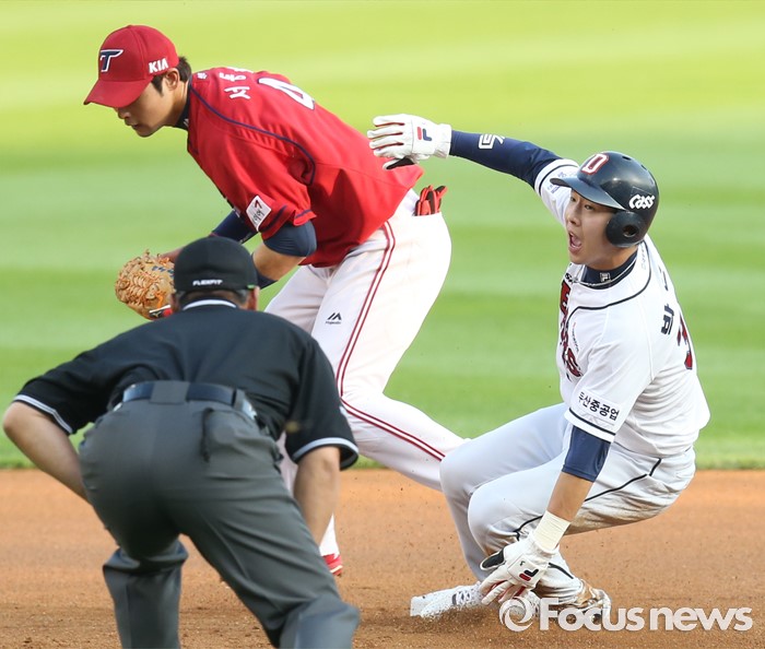 (서울=포커스뉴스) 8일 서울 잠실구장에서 열린 2016 프로야구 KIA-두산 경기에서 중전 안타로 진루한 두산 박건우가 오재원의 유격수앞 땅볼때 2루에서 포스아웃되고 있다.