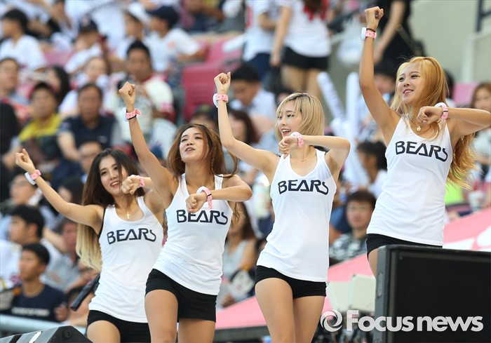 (서울=포커스뉴스) 폭염주의보가 네려진 무더운 8일 저녁 서울 잠실구장에서 열린 2016 프로야구 KIA-두산 경기에서 두산 치어리더가 더위를 날려버릴 시원한 복장으로 졍열적인 춤을 추며 팬들의 이목을 집중시키고 있다.