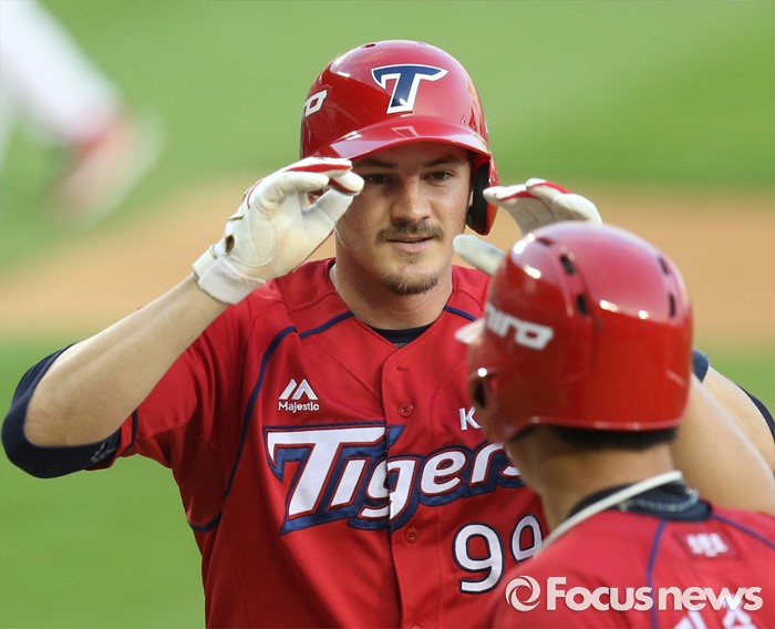 (서울=포커스뉴스) 8일 서울 잠실구장에서 열린 2016 프로야구 KIA-두산 경기 3회초 2사 1,3루에서 KIA 필이 좌월 3점 홈런을 치고 선행주자 김주찬의 환영을 받으며 홈인하고 있다.