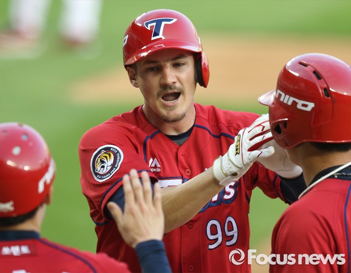 (서울=포커스뉴스) 8일 서울 잠실구장에서 열린 2016 프로야구 KIA-두산 경기 3회초 2사 1,3루에서 KIA 필이 좌월 3점 홈런을 치고 선행주자의 환영을 받으며 홈인하고 있다.