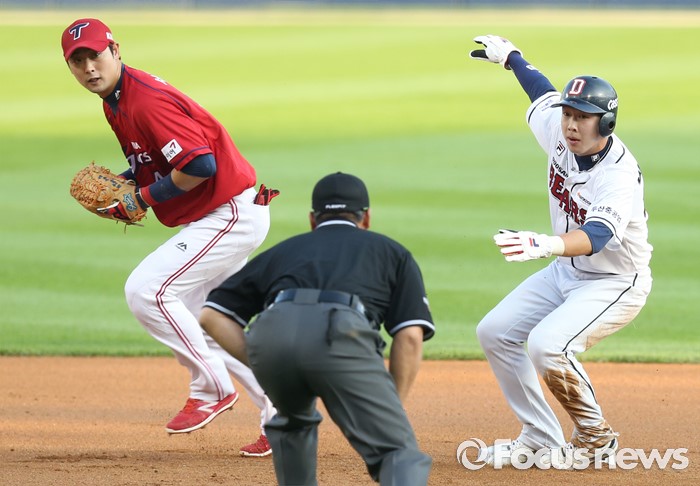 (서울=포커스뉴스) 8일 서울 잠실구장에서 열린 2016 프로야구 KIA-두산 경기에서 중전 안타로 진루한 두산 박건우가 오재원의 유격수앞 땅볼때 2루에서 포스아웃되고 있다.