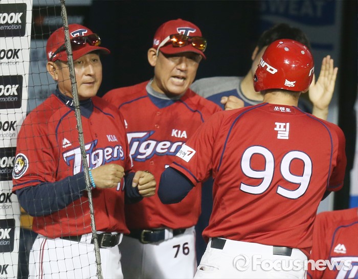 (서울=포커스뉴스) 8일 서울 잠실구장에서 열린 2016 프로야구 KIA-두산 경기 5회초 1사 1루에서 KIA 필이 연타석 홈런을 치고 덕아욱에서 김기태 감독과 조계현 코치의 환영을 받고 있다.