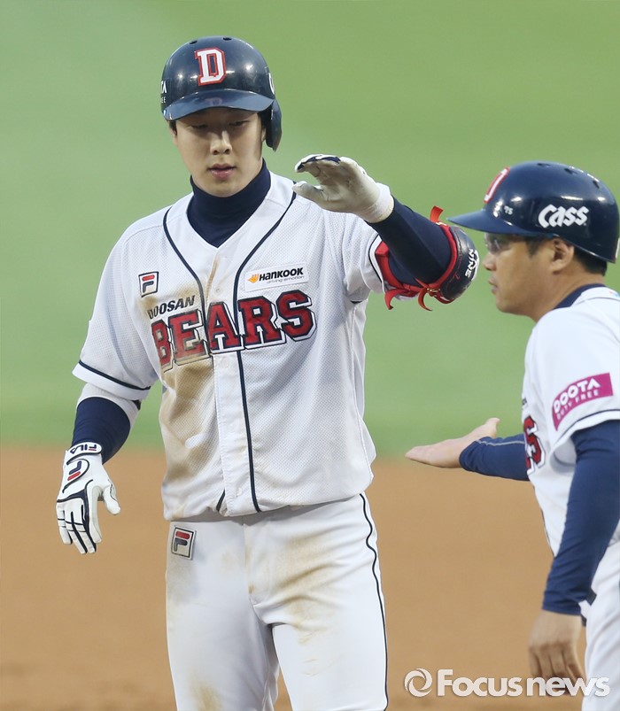 (서울=포커스뉴스) 프로야구 두산이 KIA에 연장 끝내기 승을 거뒀다. 상대 실책에 힘입은 승리. 그 과정에 두산 톱타자 박건우의 활약이 있었다.