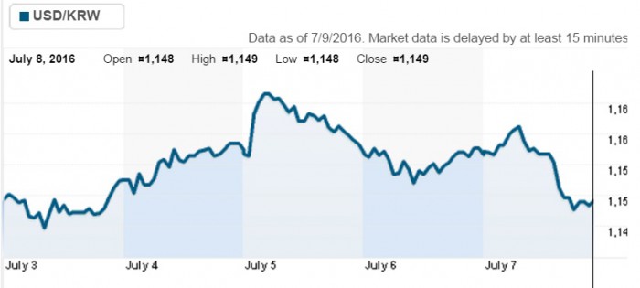또 시장은 미국 6월 고용지표가 개선됐지만 연방준비제도(연준)의 연방기금금리 상승 가능성은 적다고 내다보고 있어, 원화 가치 하락압력을 지지시켜줄 것으로 보인다. 브렉시트(영국의 유럽연합 탈퇴)로 인한 글로벌 금융시장 변동성이 커져서다.