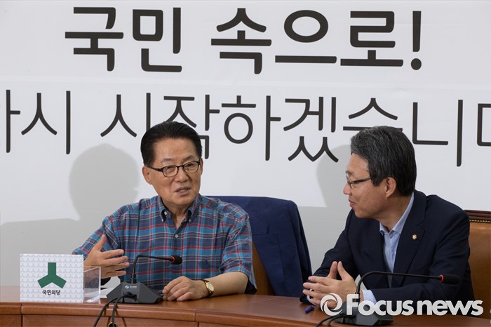 (서울=포커스뉴스) 10일 오후 서울 영등포구 국회에서 열린 선관위의 편파적 행위에 대한 대책 회의 시작 전 박지원(왼쪽) 국민의당 비상대책위원장이 김성식 정책위의장과 대화를 나누고 있다.