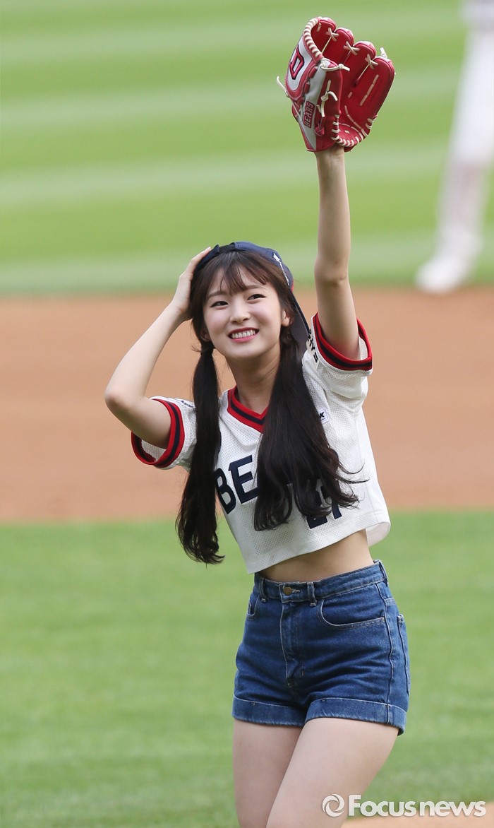 (서울=포커스뉴스) 10일 서울 잠실구장에서 열린 2016 프로야구 넥센-두산 경기에 앞서 걸그룹 '오마이걸'의 아린이 시구후 관중에게 글러브를 흔들며 인사하고 있다.