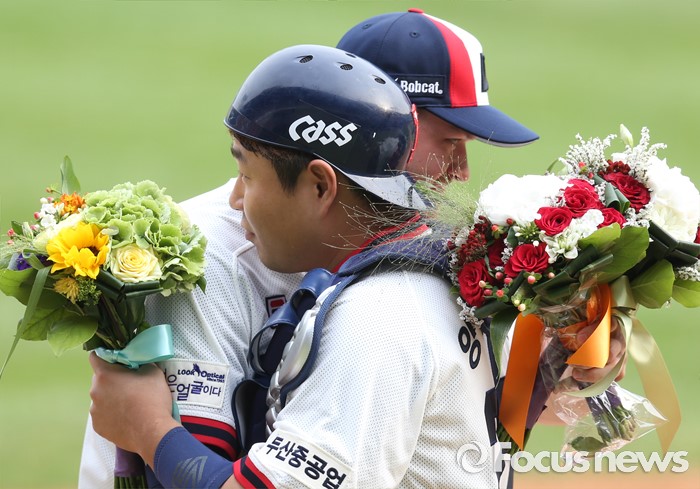 (서울=포커스뉴스) 10일 서울 잠실구장에서 열린 2016 프로야구 KIA-두산 경기에 앞서 두산 투수 보우덴의 노히트노런 시상식을 갖고 보우덴과 양의지가 포옹하고 있다.