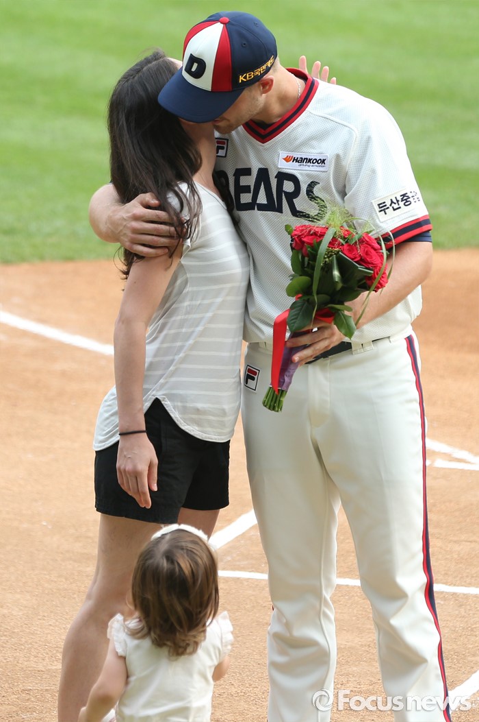 (서울=포커스뉴스) 10일 서울 잠실구장에서 열린 2016 프로야구 KIA-두산 경기에 앞서 가진 두산 투수 보우덴의 노히트노런 기록 달성 시상식에서 보우덴이 부인고 포옹하고 있다.