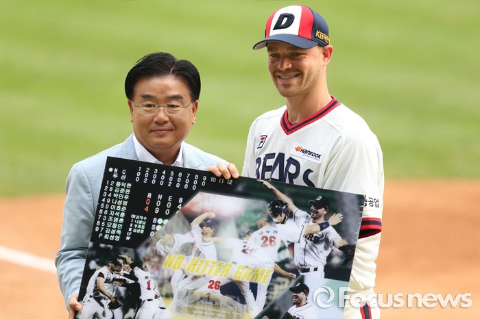 (서울=포커스뉴스) 10일 서울 잠실구장에서 열린 2016 프로야구 KIA-두산 경기에 앞서 두산 투수 보우덴의 노히트노런 시상식을 갖고 두산베어스 김태룡 단장이 기록수립 달성 사진을 전달하며 기념사진을 찍고 있다.