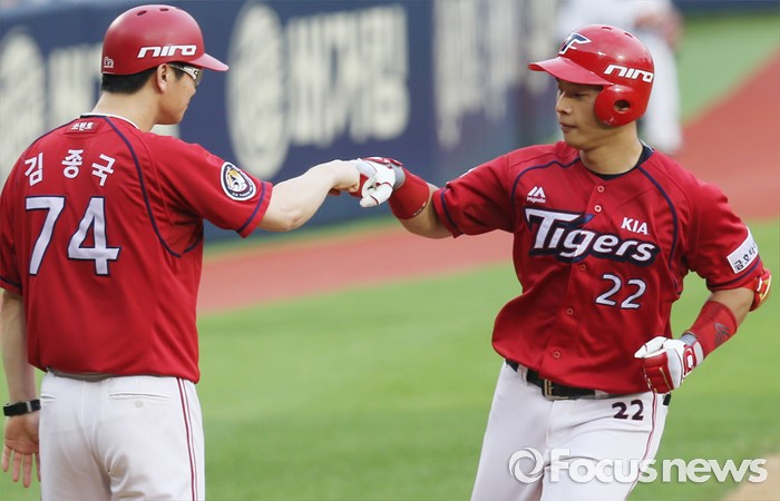 (서울=포커스뉴스) 10일 서울 잠실구장에서 열린 2016 프로야구 KIA-두산 경기 3회초 1사후 KIA 백용환이 좌월 솔로 홈런을 치고 3루를 돌며 김종국 코치의 환영을 받고 있다.
