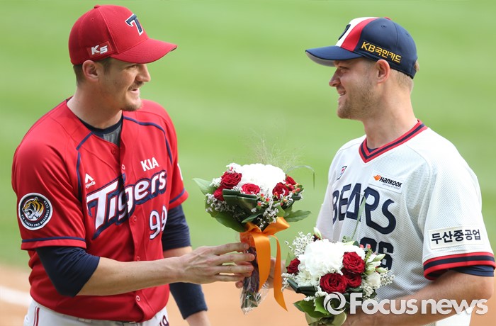 (서울=포커스뉴스) 10일 서울 잠실구장에서 열린 2016 프로야구 KIA-두산 경기에 앞서 두산 투수 보우덴의 노히트노런 시상식을 갖고 KIA 브렛 필이 보우덴에게 꽃다발을 전달하고 있다.