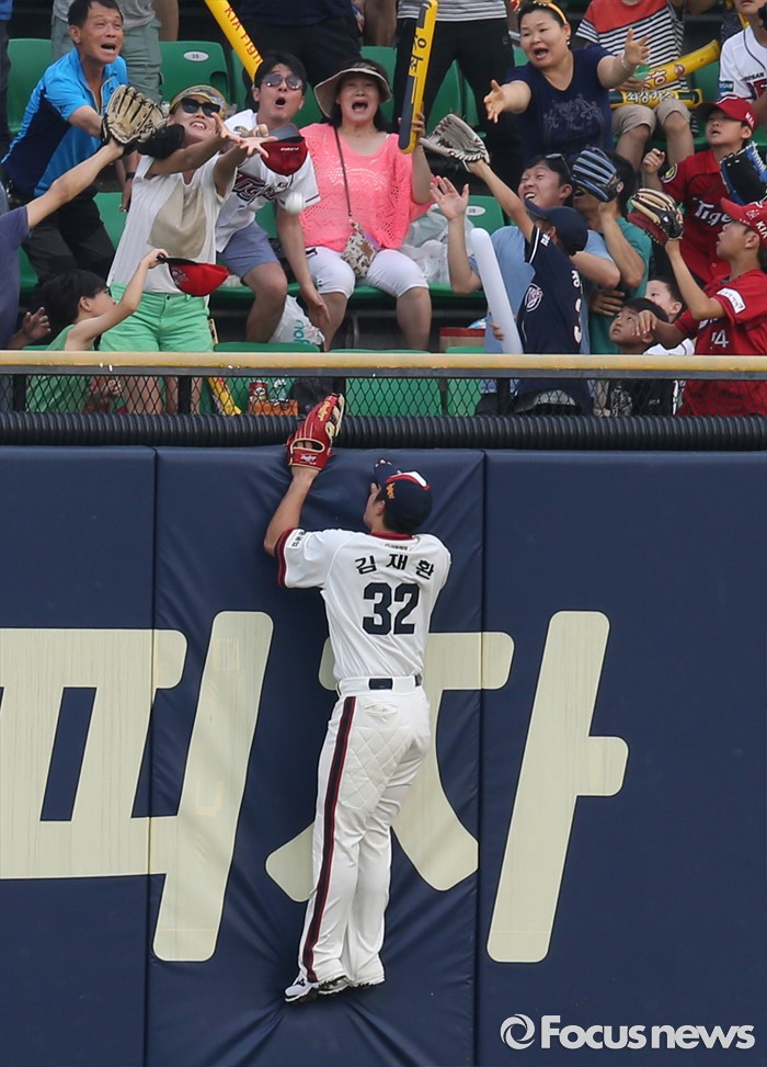 (서울=포커스뉴스) 10일 서울 잠실구장에서 열린 2016 프로야구 KIA-두산 경기 3회초 1사후 두산 좌익수 김재환이 펜스에 뛰어 올라 KIA 백용환의 홈런 타구를 바라보고 있다. 관중들은 볼을 잡으려 몰려들고 있다.