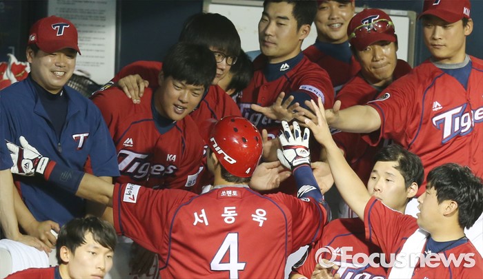(서울=포커스뉴스) 10일 서울 잠실구장에서 열린 2016 프로야구 KIA-두산 경기 7회초 2사후 KIA 서동욱이 솔로 홈런을 치고 덕아웃에서 동료들의 환영을 받고 있다.