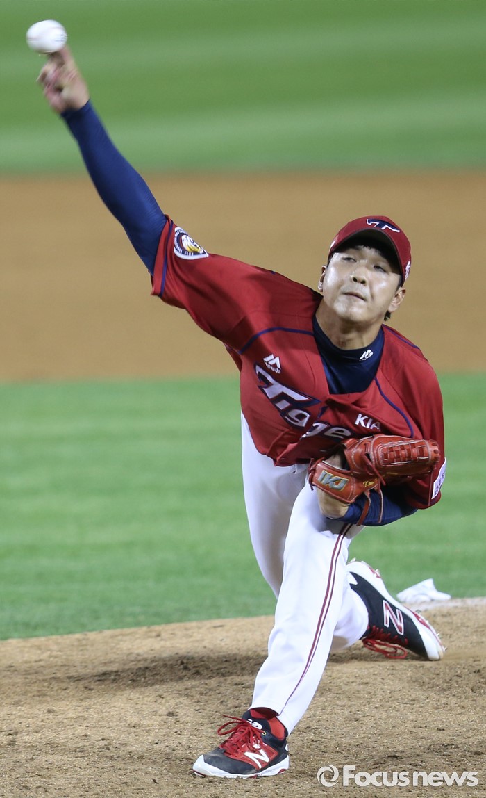 (서울=포커스뉴스) 10일 서울 잠실구장에서 열린 2016 프로야구 KIA-두산 경기에서 KIA 투수 김윤동이 9회말에 등판해 투구하고 있다.