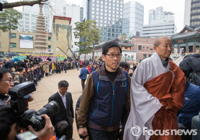 한 위원장은 지난해 4월16일부터 11월14일 1차 민중총궐기 대회까지 11차례 집회에서 특수공무집행방해치상 1회, 특수공무집행방해 3회, 특수공용물건손상 2회, 일반교통방해 7회, 주최자준수사항 위반 4회, 해산명령불응 5회, 금지장소집회참가 4회 등을 저지른 혐의로 기소됐다.한상균(왼쪽) 민주노총 위원장이 10일 오전 서울 종로구 조계사 관음전에서 도피를 마치고 도법 스님과 함께 대웅전으로 발걸음을 옮기고 있다.2015.12.10 성동훈 기자