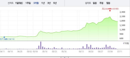 앞서 키스톤글로벌은 6월 10일부터 17일까지 6거래일 연속 상승세를 나타내는 등 꾸준히 상승세를 나타냈다. 1달 전 주가인 6월10일(1125원)과 비교했을 때 무려 56.8% 상승한 수치다.