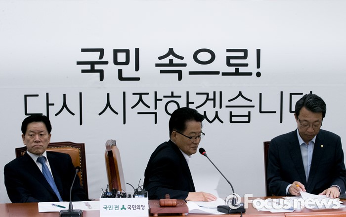 (서울=포커스뉴스) 11일 오전 서울 여의도 국회에서 열린 국민의당 비상대책위원회의에 참석한 박지원 비대위원장 등 의원들이 백보드 교체 관련 설명을 들은 뒤 회의를 준비하고 있다.