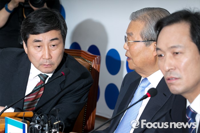 (서울=포커스뉴스) 11일 오전 서울 여의도 국회에서 열린 더불어민주당 비상대책위원회의에 참석한 김종인(가운데) 비대위 대표와 이종걸(왼쪽) 비대위원이 대화하고 있다. 오른쪽은 우상호 원내대표.