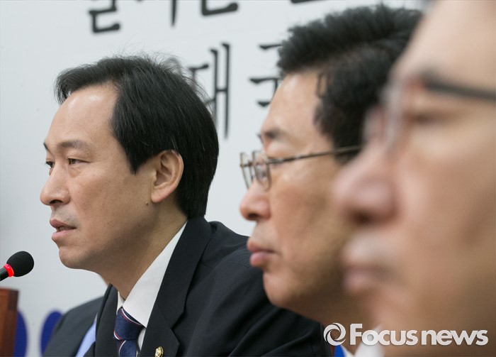(서울=포커스뉴스) 11일 오전 서울 여의도 국회에서 열린 더불어민주당 비상대책위원회의에 참석한 우상호(왼쪽) 원내대표가 발언하고 있다.