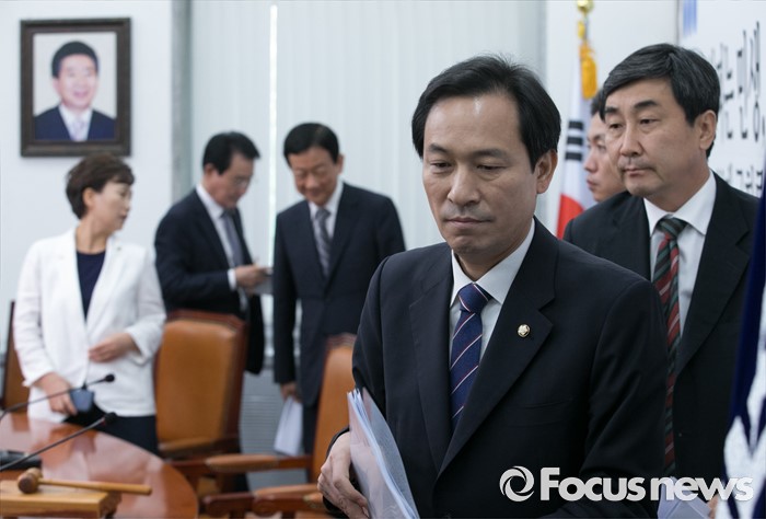 (서울=포커스뉴스) 11일 오전 서울 여의도 국회에서 더불어민주당 비상대책위원회의를 마친 우상호(오른쪽 두번째) 원내대표가 퇴장하고 있다.