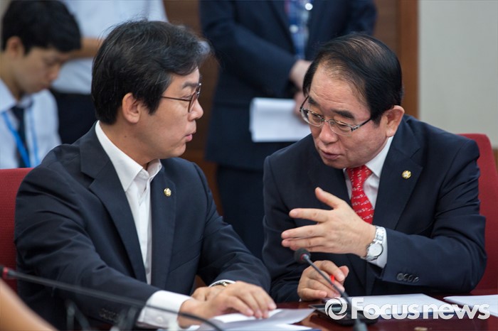 (서울=포커스뉴스) 박명재(오른쪽) 새누리당 사무총장과 김영우 의원이 11일 오전 서울 여의도 새누리당사에서 열린 혁신비상대책위원회의에 참석해 대화 하고 있다.