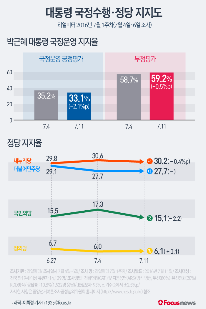 (서울=포커스뉴스) 여론조사 기관 리얼미터의 2016년 7월 1주차 주중집계에 따르면 박근혜 대통령의 국정수행 지지율이 30%대 초중반으로 하락했다. 주요 3당의 지지도는 하락하거나 정체한것으로 조사됐다.