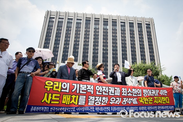 (서울=포커스뉴스) 11일 오전 서울 종로구 정부서울청사 정문 앞에서 열린 사드 배치 환영 기자회견에 참석한 보수단체 회원들이 기자회견문을 읽고 있다.