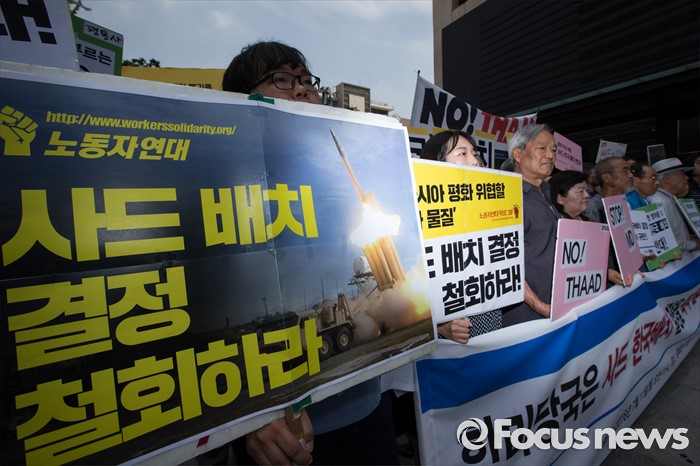 (서울=포커스뉴스) '평화와 통일을 여는 사람들' 관계자 및 사드 한국 배치를 반대하는 시민들이 11일 오전 서울 종로구 창조경제 혁신센터 앞에서 사드 한국 배치 결정 철회 촉구 기자회견을 하고 있다.