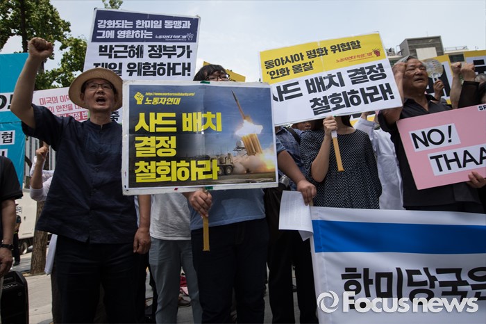 (서울=포커스뉴스) '평화와 통일을 여는 사람들' 관계자 및 사드 한국 배치를 반대하는 시민들이 11일 오전 서울 종로구 창조경제 혁신센터 앞에서 사드 한국 배치 결정 철회 촉구 기자회견을 하고 있다.