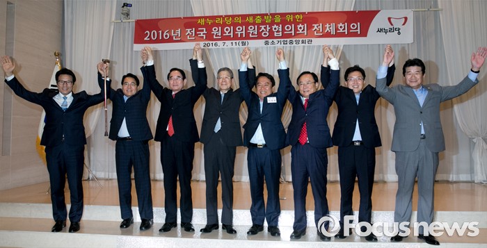 (서울=포커스뉴스) 11일 오후 서울 여의도 중소기업중앙회관에서 열린 새누리당 전국원외위원장협의회 전체회의에 참석한 지도부와 전당대회 출마자 등이 취재진을 향해 포즈를 취하고 있다. 왼쪽부터 정병국 의원, 심재철 국회 부의장, 박명재 사무총장, 김희옥 혁신비대위원장, 이성헌 전국원외위원장협의회장, 이주영, 김용태, 강석호 의원.