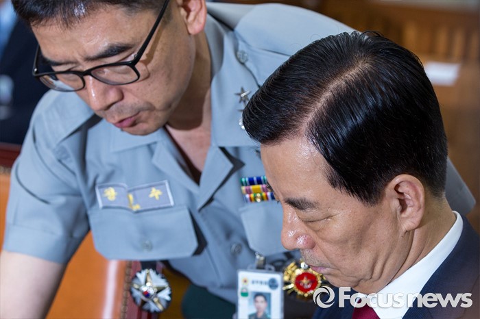 (서울=포커스뉴스) 한민구(오른쪽) 국방부 장관이 11일 오후 서울 여의도 국회에서 열린 국방위원회 전체회의에 참석해 국방부 관계자와 대화 하고 있다.