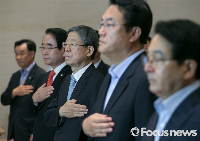 (서울=포커스뉴스) 11일 오후 서울 여의도 중소기업중앙회관에서 열린 새누리당 전국원외위원장협의회 전체회의에 참석한 심재철(앞줄 오른쪽부터) 국회 부의장, 정진석 원내대표, 김희옥 혁신비대위원장, 박명재 사무총장 등이 국기에 대한 경례를 하고 있다.