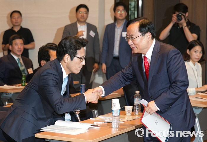 (서울=포커스뉴스) 11일 오후 서울 여의도 중소기업중앙회관에서 열린 새누리당 전국원외위원장협의회 전체회의에 전당대회 출마를 선언한 이주영(오른쪽), 정병국 의원이 인사하고 있다.